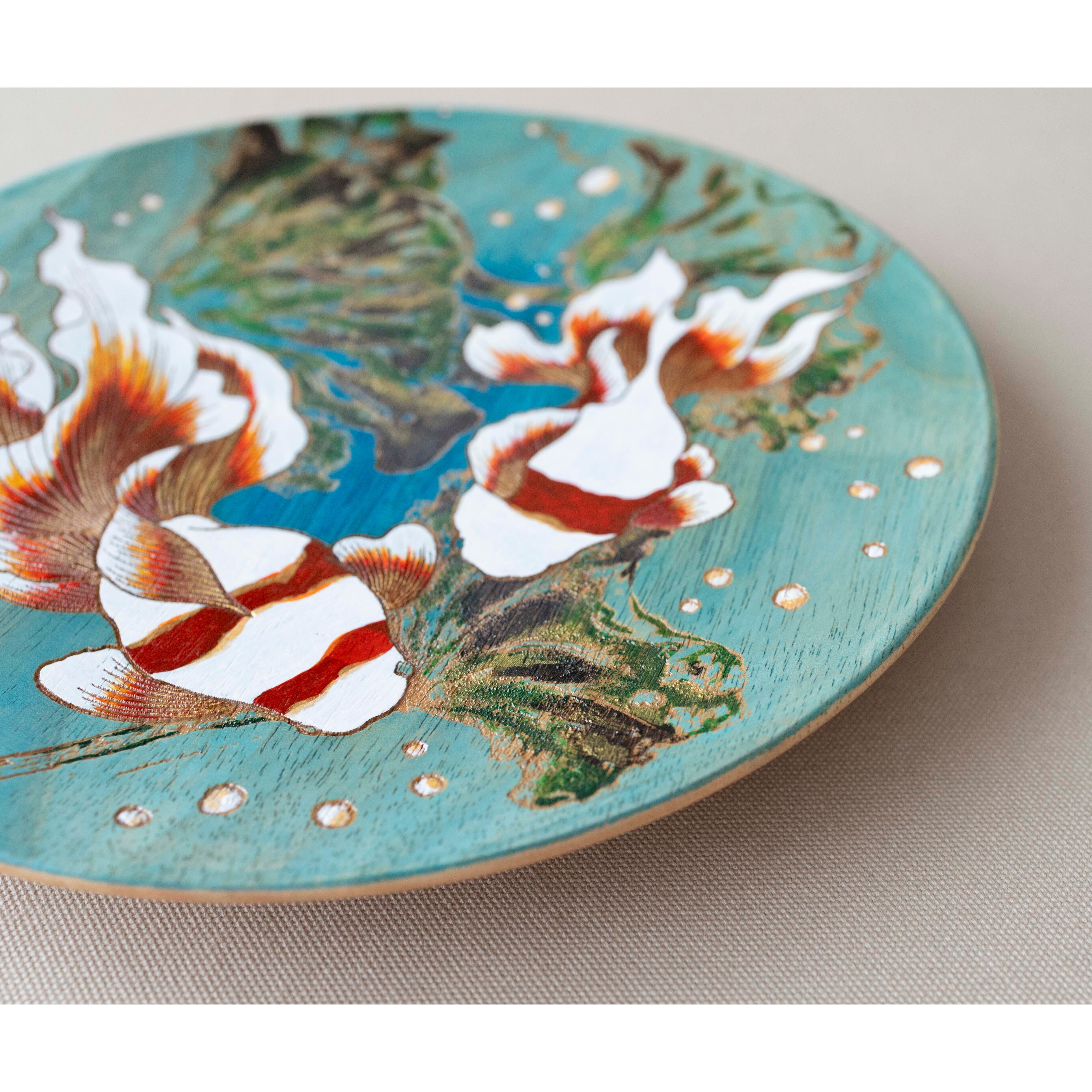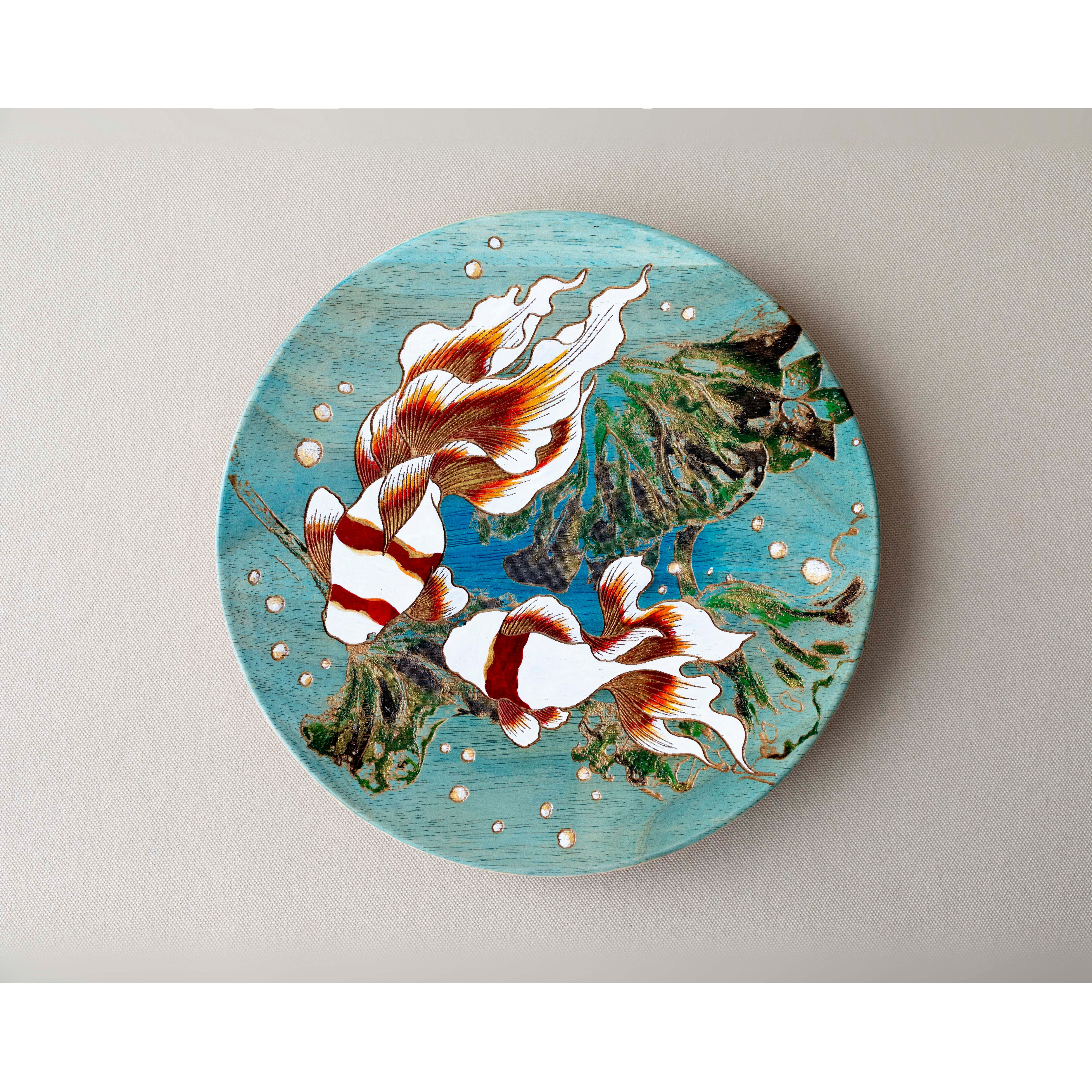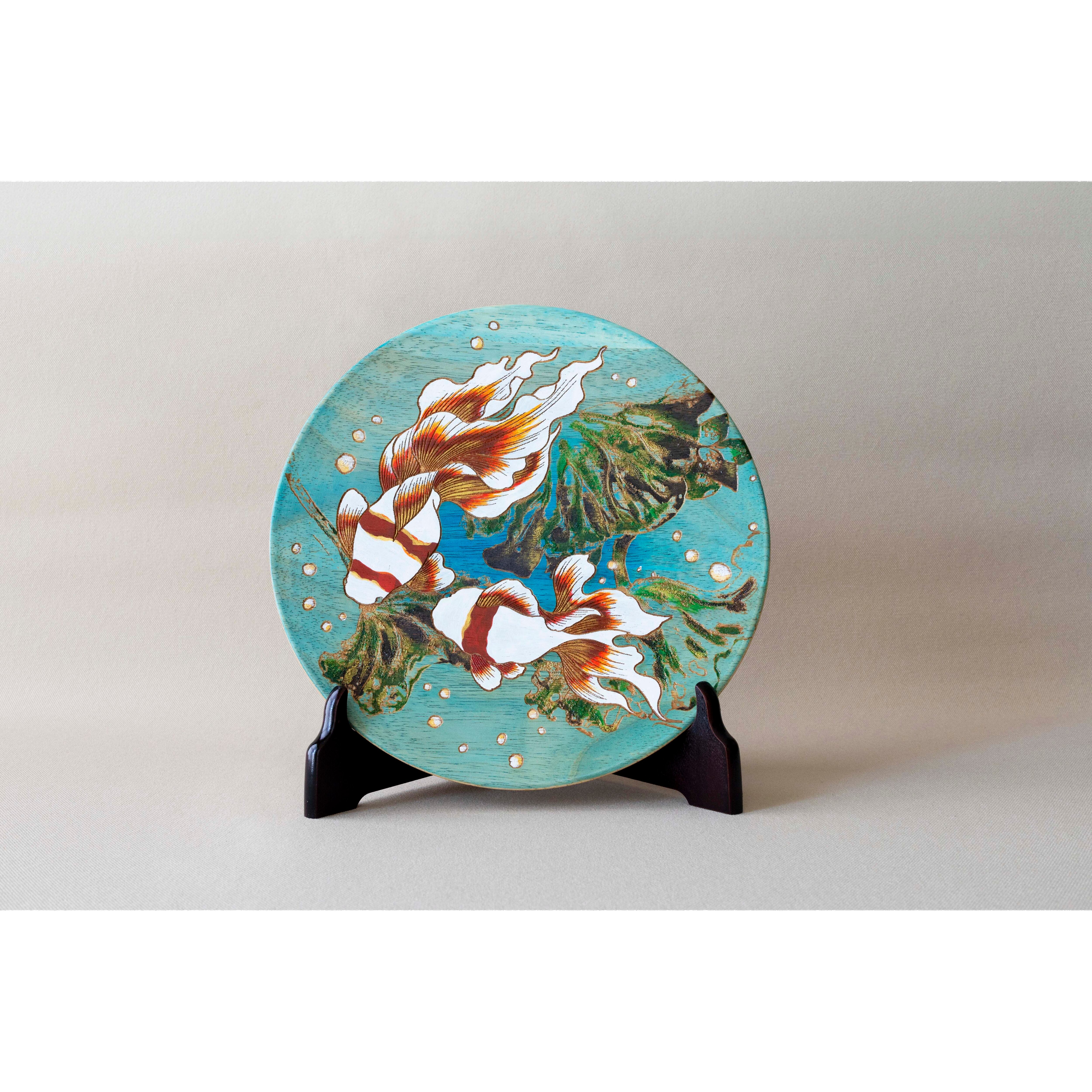 涼やかな薄藍色の背景に、ゆらゆらと泳ぐ2匹の金魚と蓮の葉をあしらった飾り皿です。