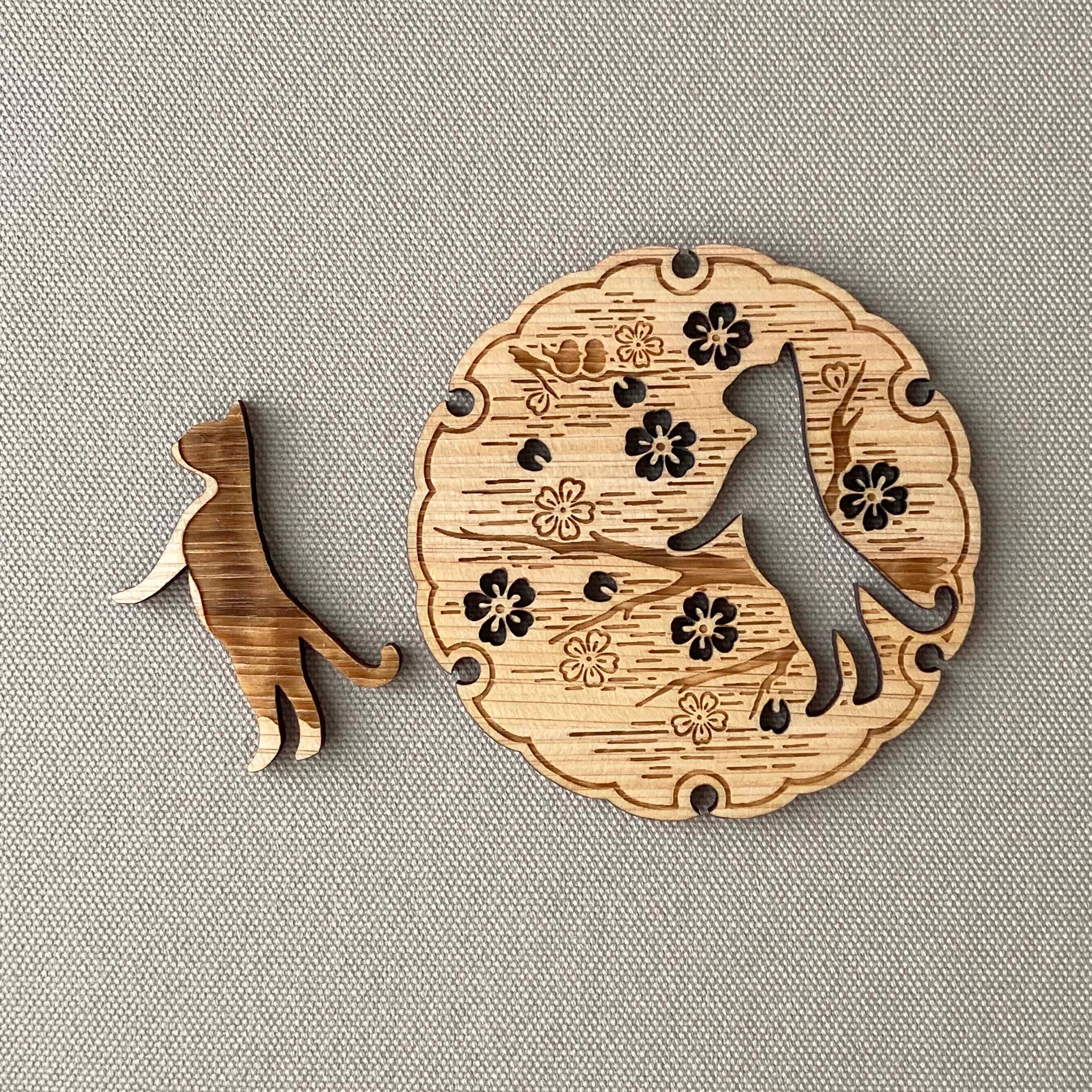 繁栄を意味する雪輪の形に、背伸びしたハチワレが桜の木で休んでいる鳥とまるで会話をしているようなシーンをレーザー彫刻で表現しました。